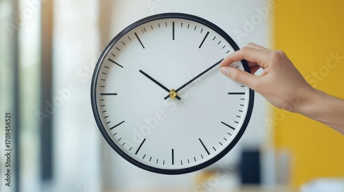 A hand adjusts the time on a large wall clock with a minimalist design, set against a bright, modern background.