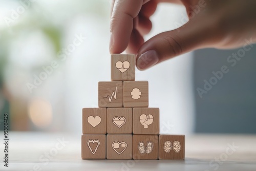 a hand constructing a tower with wooden blocks featuring various medical icons, such as a heart and a brain, to convey the idea of building a strong foundation for health through insurance