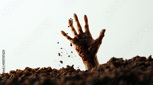 A hand emerging from the soil, symbolizing struggle and rebirth, isolated on white.