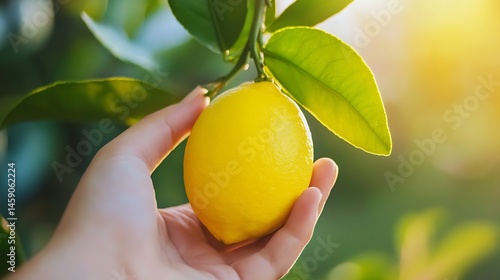 A hand gently holds a ripe, yellow lemon plucked fresh from a tree branch, sunlight illuminating the citrus fruit and green leaves. : Generative AI