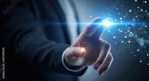 hand, touching, finger, suit, blue, light, bright, node, network, connection, digital, datum, technology, abstract, futuristic, modern, innovation, cyber, information, system, communication, global, virtual, interface, interaction, science, research, development, future, business, strategy, growth, progress, success, achievement, goal, corporate, professional, clean, sharp, sharpened, depth, blur, studio, dark, background, visual, graphic