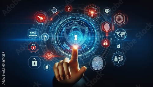 A hand interacts with a futuristic digital interface that displays various cybersecurity icons representing advanced digital security.