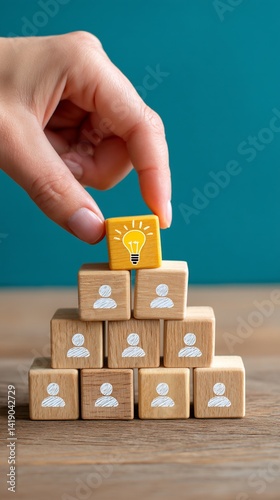 A hand places a block with a lightbulb icon atop a pyramid of blocks, each with a person icon, symbolizing leadership and innovation