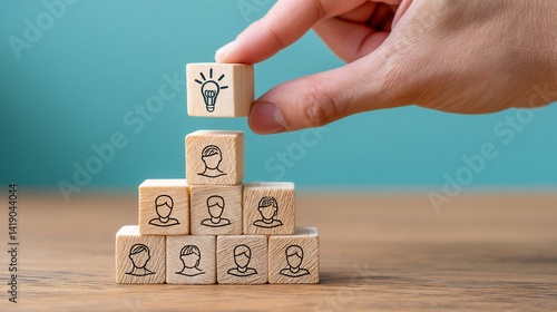 A hand placing a lightbulb-shaped block atop a pyramid of person-shaped blocks
