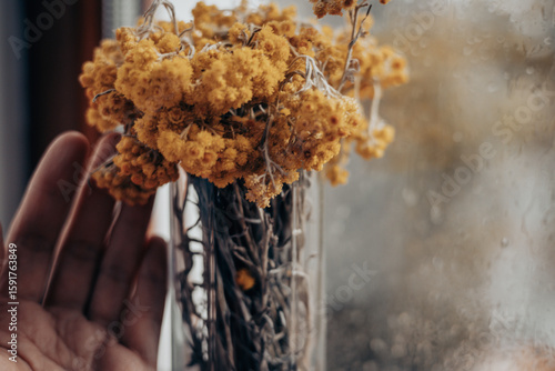 yellow flower, bouquet, vintage, dried flowers, still life, aesthetic, autumn, rain, fall season, artistic, bokeh, hand, achieving, finger, touch, glasses, vase, flower, floral, arrangement, beauty, nature, natural, soft, light, composition, detail, texture, closeup, blur, background, warm, calm, serene, home decor, delicate, minimalist, simple, elegant, contemporary, studio, lifestyle, autumn, october, september, rainy