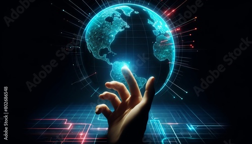 A hand reaching towards a high-tech digital interface that has glowing neon geographic grid lines against a dark background.