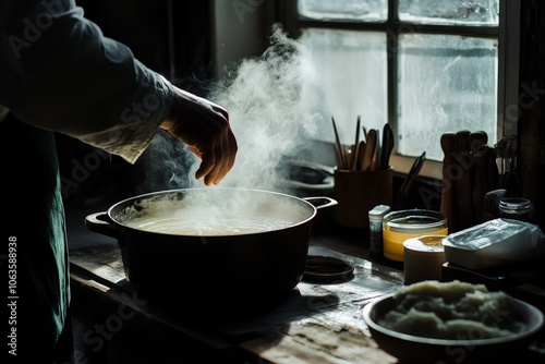 hand, stir, steam, pot, stove, kitchen, warmth, home, cooking, detail, attention, care, culinary, passion, sunlight, simmer, sharpened, modern, everyday, classic, wooden, window, light, angle, cosy, comforting, serenity, hand, vessel, ingredient, aroma, taste, favor, chef, creativity, skill, life events, domestic, artistry, time, harmony, balance, preparation, delicious