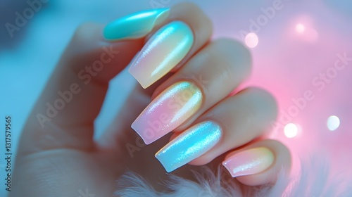a hand with beautifully painted long nails, showcasing a pearlescent, multi-colored finish