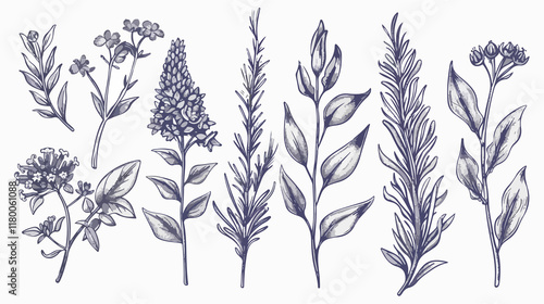 A hand-drawn illustration of lavender floral herbs, showcasing delicate, detailed flowers and leaves.