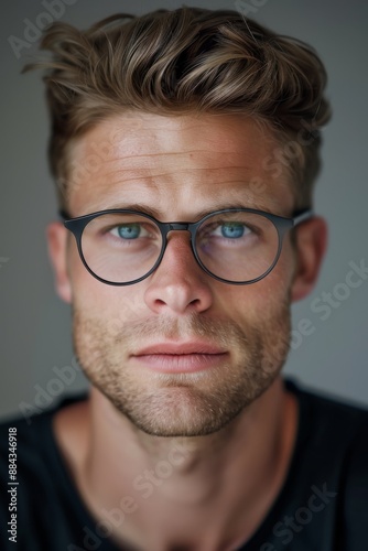 a handsome 25-year-old man with short blond hair, blue eyes behind stylish glasses with thin frames. He has an intellectual and authoritative presence.