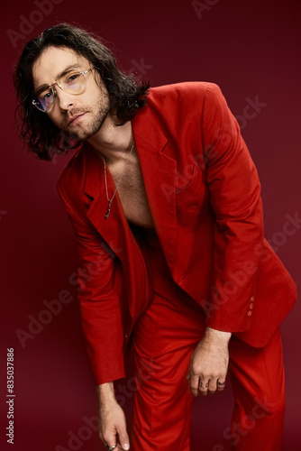 A handsome man in a striking red suit and glasses poses confidently, exuding style and sophistication.