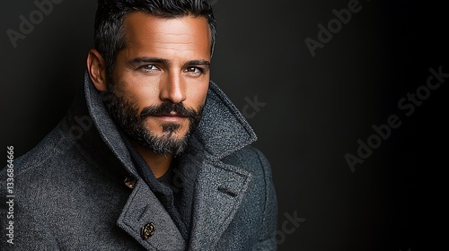 man, portrait, face, beard, coat, jacket, collar, buttons, grey, dark, hair, photogenic, stylish, look, fashion, clothing, wool, texture, closeup, confident, sophisticated, gaze, eyebrow, eye, nose, lip, cheek, chin, neck, shoulder, chest, studio, professional, skin, shadow, lighting, contrast, detail, head shot, human, adult, masculine, model, attractive, person, warm, cold, background