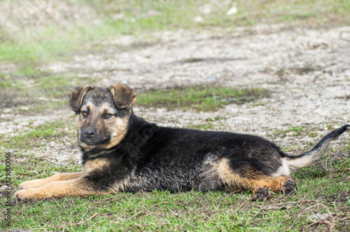 A handsome puppy abandoned. The puppy warms up in the sun. He rests on the grass