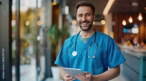 A handsome surgeon holds a tablet to promote medical innovation and modern technology in medical work. A blue surgeon shows modern medical technology and poses for photos