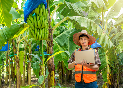 A handsome young farmer inspects his organic banana plantation, using modern technology to increase yields while preserving the environment by reducing the use of harmful chemicals for consumption.