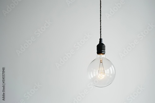 A hanging light bulb illuminates a minimalist space with a soft glow. on white background