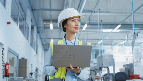 A Happy and Smiling Asian Female Engineer in White Hard Hat Standing with Laptop Computer at Electronic Manufacturing Factory. Successful Employee Watching the Work Flow
