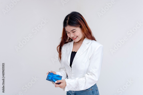 white background, office, business, white-collar, professional, agent, work, company, entrepreneur, realtor, job, task, woman, asian, female, filipino, indonesian, malaysian, vietnamese, thai, filipina, business attire, successful, person, gift, present, birthday, ribbon, surprised, delighted, happy, elated, glad, shy, thankful, engaged, eager, fun, smiling, upbeat, jolly, like, positive