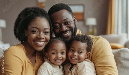 A happy black colored family with two children sitting on the sofa at home, laughing and playing together in the living room. High-quality, realistic photograph.