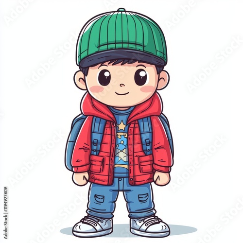 boy, happy, winter, clothes, backpack, red, jacket, green, hat, beanie, blue, jean, shoe, sneaker, cartoon, illustration, drawing, cute, adorable, cheerful, smiling, children, children, young, small, apparel, fashion, style, casual attire, outdoors, travel, adventure, fun, playful, vibrant, colours, design, graphic, image, artwork, character, portrait