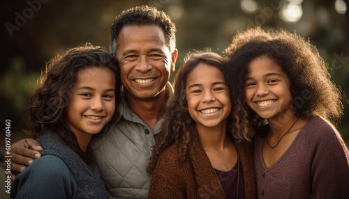 A happy, cheerful family bonding outdoors, looking at camera generated by AI