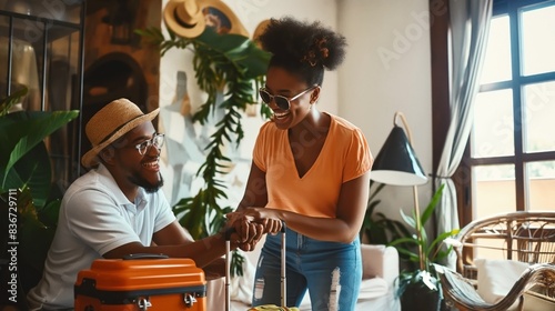 A happy couple preparing for a trip, with luggage and a cozy home interior filled with plants and natural light.