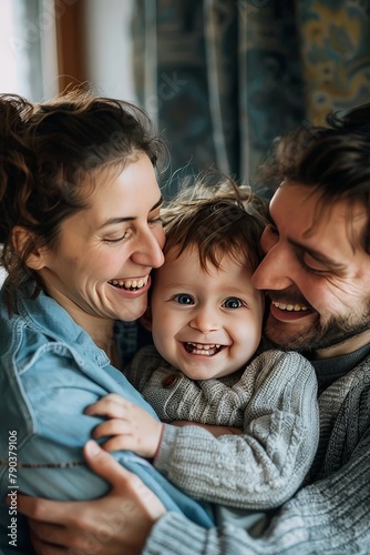 A happy family portrait of parents hugging their baby and smiling joyfully. The image captures the love, togetherness, and warmth of family life at home.