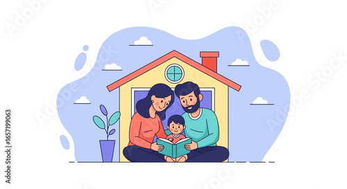 A happy family reads a book together at home, emphasizing love, learning, and domestic harmony. Ideal for parenting, education, and secure living concepts.