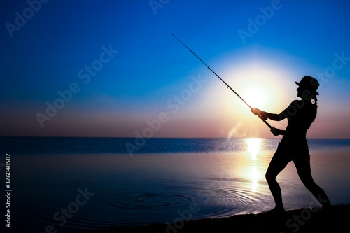 A Happy girl fisherman catches fish by the sea on nature silhouette travel