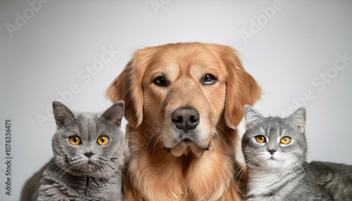 A Happy Golden Retriever and Grey Cat Posing Together in a Studio Setting