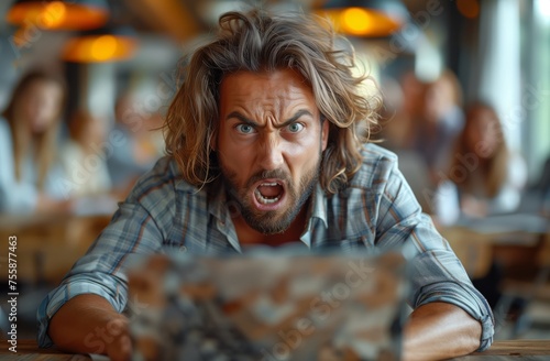 A happy man with long hair and a beard is sitting at a table with his mouth open