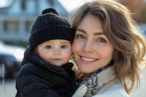 A happy middle-aged woman of European appearance holds her six-month-old son in her arms. They stand against the background of a house on a spring day. We walk with the child,