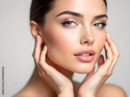 model, beauty, portrait, woman, female, face, skin, healthy, glowing, fresh, natural, smile, happy, young, pretty, attractive, elegant, hand, touch, expression, pose, graceful, radiant, clear, smooth, flawless, clean, minimalist, background, soft, lighting, professional, closeup, studio, fashion, lifestyle, wellness, skincare, treatment, cosmetic, make-up, hair, care, gentle, delicate, aglow, serene, refined, poised
