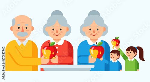 hashanah, family, grandparent, children, boy, girl, apple, fruit, healthy, food, sharing, togetherness, love, joy, happiness, generation, elderly, young, people, portrait, illustration, graphic, design, cartoon