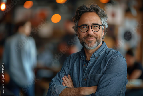 A happy professional man in office with eyeglasses, folded arms and confident expression as other workers hold a meeting in background.