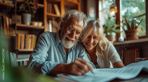 A happy senior couple is reading together in their cozy home library filled with books and plants