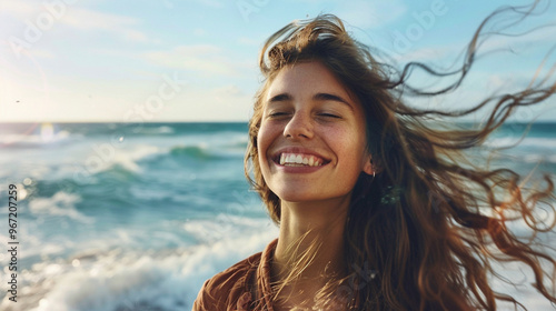 happy, woman, long hair, flowing, standing, smiling, brightly, crashing, serene, peaceful, joy, content, carefree, beauty, nature, relaxation, vacation, sunny day, coastal, paradise, blissful, freedom, wind, wave, sandy shore, summer, outdoors, sunlight, tranquil, refreshing, euphoric, cheerful, vibrant, positive, radiant, elated