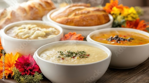 A harvest table with bowls of steaming soups, freshly baked bread, and colorful fall flowers as decoration