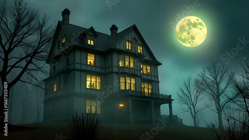 A haunted house nestled on a windswept hillside, illuminated by silver moonlight and a light mist.
