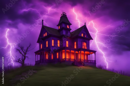 A haunted house on a hill with vibrant purple mist glowing orange windows and neon green lightning, Ai Generated