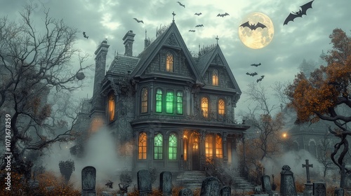 A haunted Victorian-style house bathed in the eerie light of a full moon. The windows emit a faint green glow, while twisted trees and tombstones fill the front yard. Bats circle above.