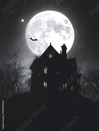 A haunting silhouette of an old haunted house against a full moon with eerie atmosphere and ghostly vibes