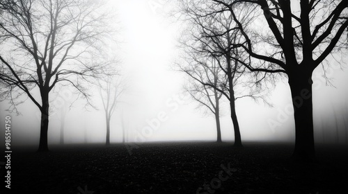 A hauntingly beautiful foggy forest scene with bare trees silhouetted against a misty background.