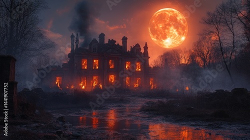 A hauntingly beautiful scene of a burning mansion illuminated by a colossal full moon against a dark, moody sky