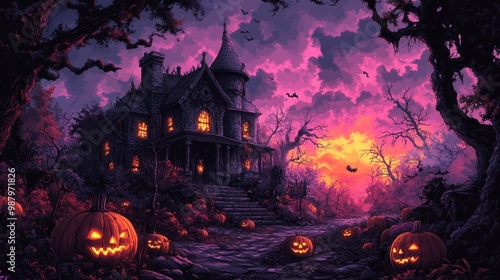 pumpkin, twilight, autumn, skittish, eerie, halloween, night, bat, tree, shadow, old building, landscape, festive, decoration, purple sky, warm light, ghostly, creepy, season, supernatural, mystery, scenery, abandoned, fall, harvest, tradition, celebration, folklore, fright, gothic, moonlight, nostalgia, evening, tranquil, horror, window, stone, haunted, pumpkin, carving, thrill, fantasy, art, nature
