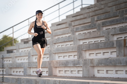 A healthy adult Asian woman running up on concrete stairs of the city stadium to strengthen body