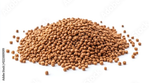 A heap of crunchy dog food pellets, evenly spaced on a white background, perfect for pet product displays