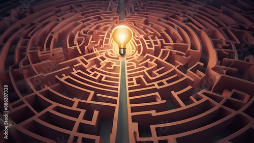 A heart-shaped maze with a path leading to a glowing light bulb, representing the journey of ideas and inspiration