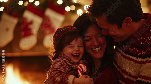 A heartwarming close-up of a family of sharing a group hug in front of a glowing fireplace. The parents wear festive sweaters, and the child is laughing with a candy cane in hand