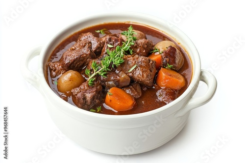 A hearty and flavorful French beef bourguignon stew, cooked with red wine and simmered with carrots, onions, and mushrooms. It's a classic French comfort food, perfect for a cold winter day.